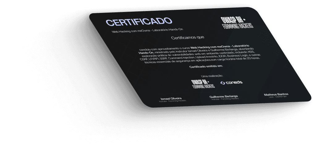 Ao completar o curso Web Hacking com meOwna - Laboratório Hands-On, você recebe um certificado assinado por: